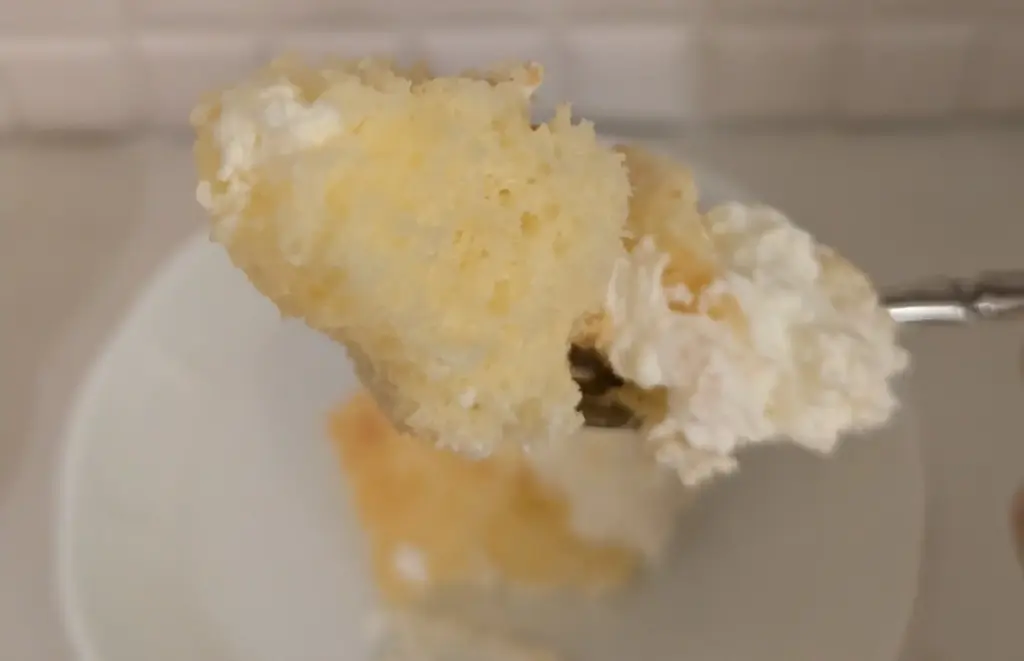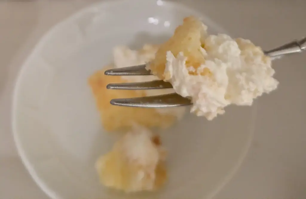 左:シフォンとクリームをフォークですくって口に運ぼうとすると…