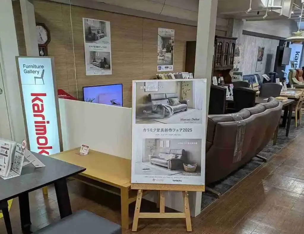 高槻店では、「マナベオリジナルオーダーカーテンフェア」や「カリモク家具新作フェア2025」が開催されています。