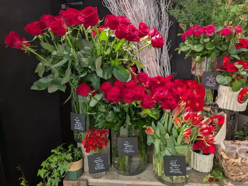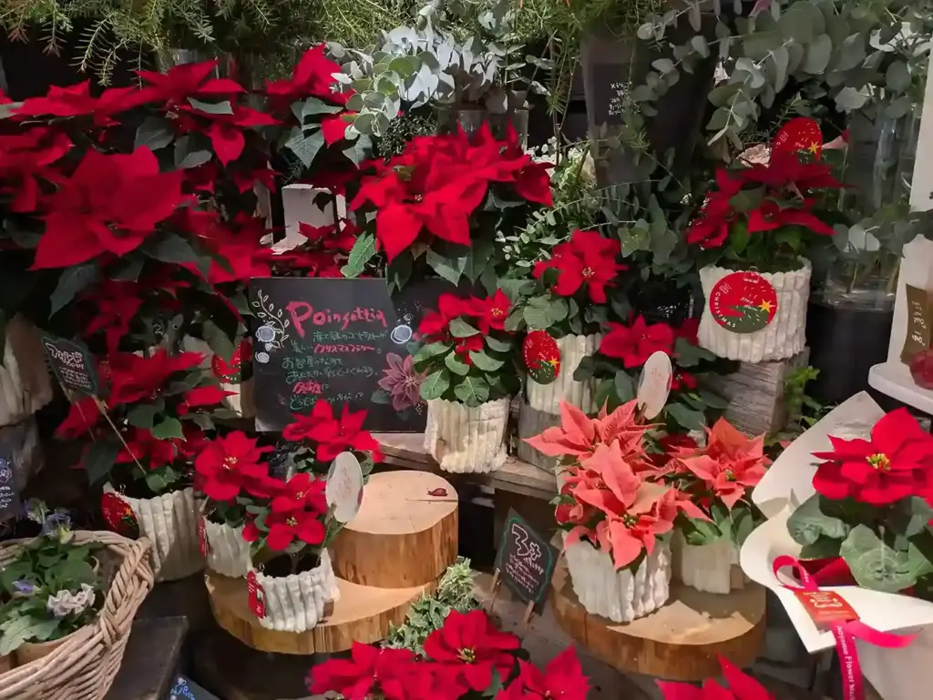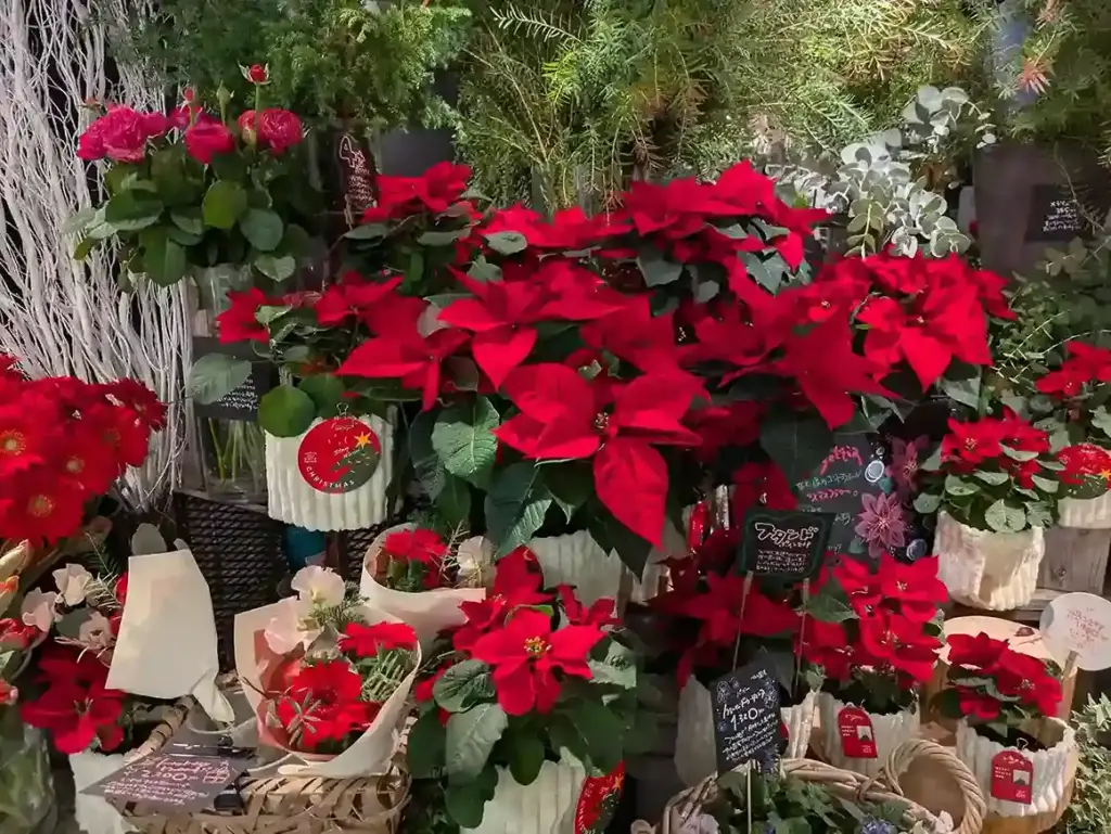 クリスマスを前に、青山フラワーショップの店頭にはポインセチアや深紅のバラなどが並んでいます。