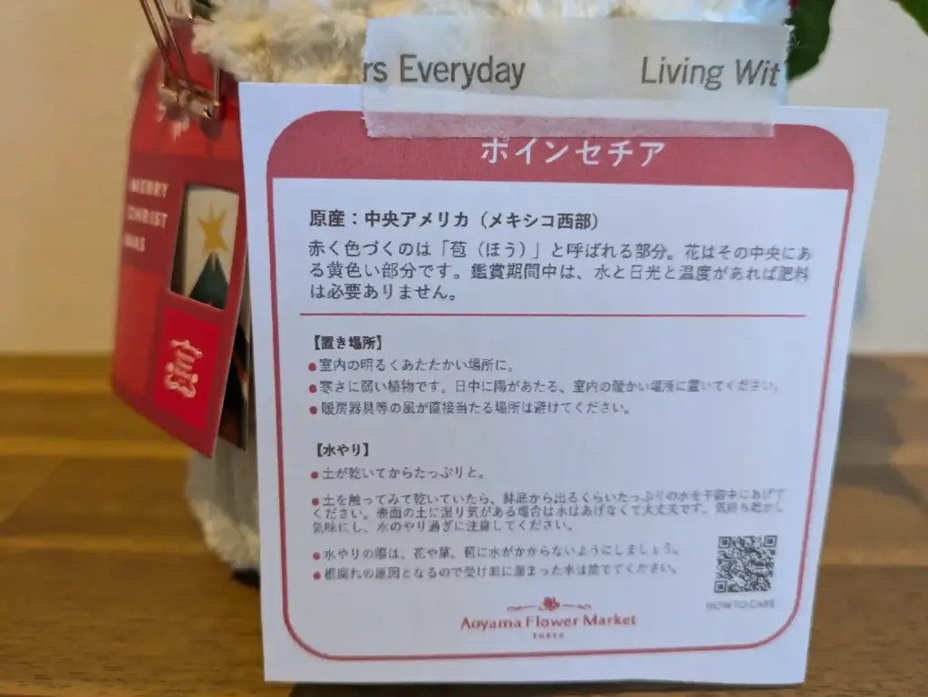 真っ赤な中に並ぶ、少しピンクがかったポインセチアも素敵です。でもやっぱり選ぶならばクリスマスのイメージは赤ですよね…と鉢植えのポインセチアをゲット♪説明書も付けてくれました。