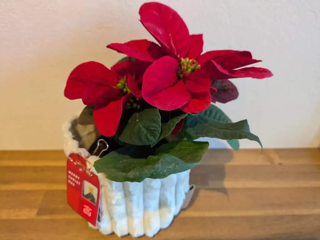 ポインセチアの花言葉は、「祝福する」「幸運を祈る」「私の心は燃えている」など。赤いバラの花言葉は「愛情」。ということで、日頃の感謝の気持ちを伝えるクリスマスギフトにもぴったりですね。