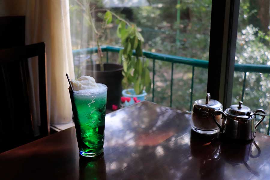 隣接する原田神社の木々が窓の外に見える2階では、特等席の窓際でゆっくりくつろぐのがおすすめ。ノスタルジックな外観に合わせて、純喫茶の定番・クリームソーダやオムライスを思わず注文したくなります。