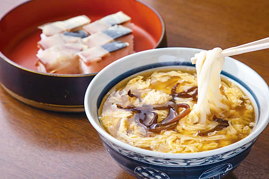 店主おすすめの「けいらん」693円は、軟らかいうどんが大阪流。あんかけだしをふんわりと卵でとじ、キクラゲの食感がアクセントに。バッテラを添えれば、これぞ懐かしい大阪庶民の味です。