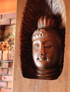 壁をよく見てみると、柱に彫り込まれた仏像が3体。創業当時、インテリアの一部として取り入れられたそうです。
