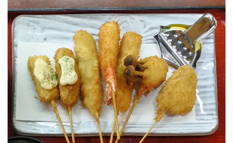 阪急三番街の開業からある、旬の食材にひと手間加えた串カツの名店「串かつ料理 活(かつ)」。