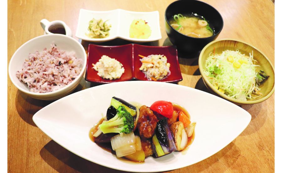 今回いただいたのは、「若鶏と季節野菜の黒酢あん定食」1,408円。出汁(だし)を生かした味つけに、彩り豊かな旬の野菜がたっぷり入っています。