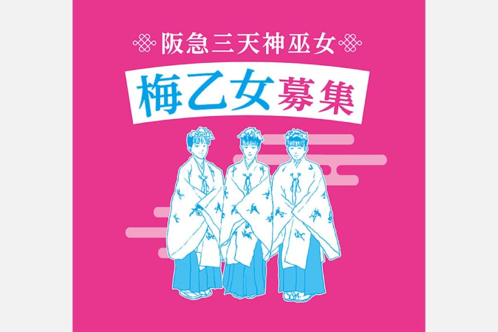 阪急沿線にある、菅原道真公縁(ゆかり)の三社で巫女「梅乙女」を募集。祭礼日に巫女装束姿で、お守りやお神酒の授与、祈祷の際の鈴振りなどの奉仕をする。初心者も歓迎なので、ぜひ応募を。