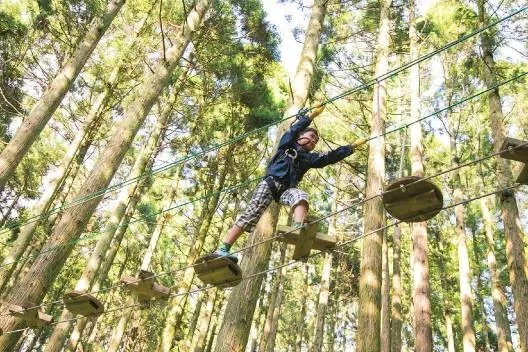 ハーネスを装着して挑む空中系のアスレチックで、木々の上に設置された37ポイントのアスレチックと往復約457mを滑り降りる2ポイントの空中アスレチックはスリル満点で大人も楽しめます。