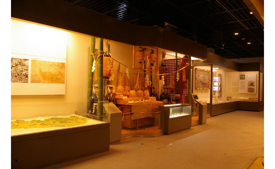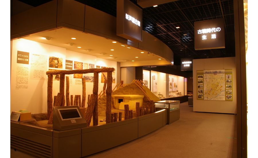 第一展示室では、資料や模型、ビデオなどを時代順に展示解説。新芦屋古墳の主体部の復原は、全国的にも珍しい木室を主体部とした「木室墳」で、その中でも石棺を持つ唯一の古墳です。また山田下村の復原模型(江戸時代末期)や、吉志部神社の「どんじ祭り」の様子なども展示しています。