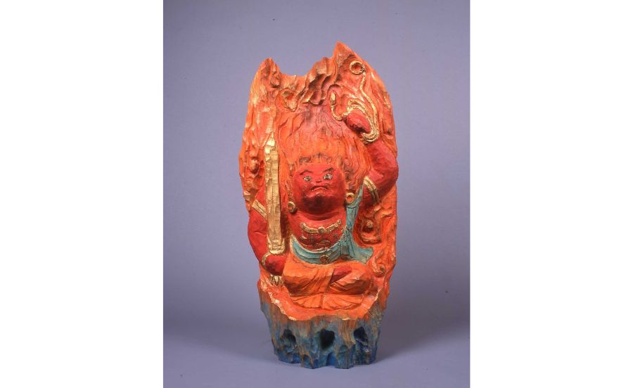 「不動明王」は燃え盛る炎を背に、右手に剣をもち、左手には羂索(けんさく。青、黄、赤、白、黒の五色の糸からなる縄状の仏具)を持った不動明王を彫り出した作品です。目を見開き、口元をしっかりと結んだ厳しい表情ではありますが、童子のような丸みを帯びた姿からは可愛らしさが感じられます。