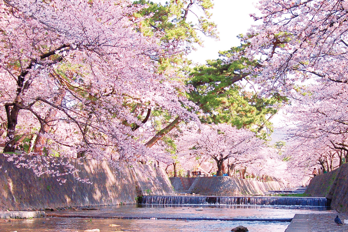 日本のさくら名所100選に選ばれたスポット。川の両岸に植えられた桜に加えて、水面に反射して映り込む桜も美しい。阪急電車と桜の共演が撮影できるスポットも!公園には遊具もあります。