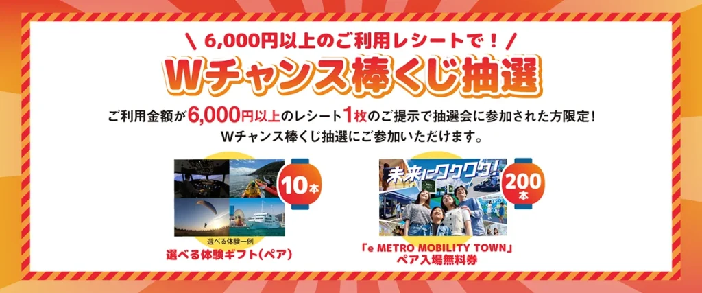 1会計の利用レシート6,000円以上で抽選会参加の方だけの限定特典として、「選べる体験ギフト(ペア)」「e METRO MOBILITY TOWNペア入場無料券」いずれかが当たる、Wチャンス棒くじ抽選にチャレンジできます。
