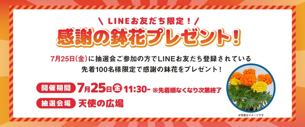 7月25日感謝祭Happy Week抽選会参加者で、ドーチカ公式LINEアカウントにお友だち登録者は、先着100名限定で、感謝の鉢花プレゼント!