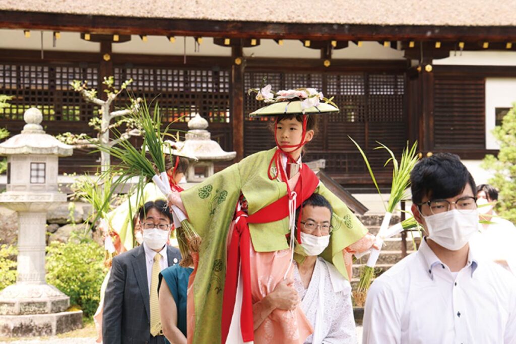 本殿にて五穀豊穣を祈願し、3人の植女(うえめ)が早苗を手に壮夫の肩に乗り境内を3周。この早苗を田に植えると虫害にかからないという。昔はこの時期に田植えをしていたが、いつからか予祝(よしゅく)行事の様式に変化した。