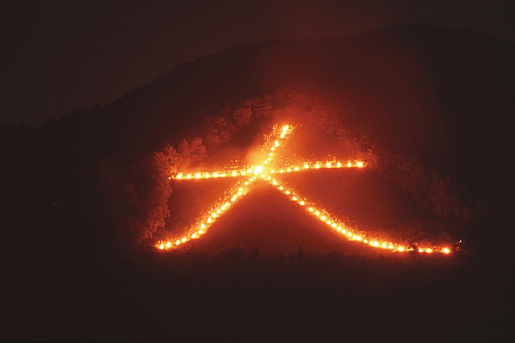 山の中腹に設置された火床に順次点火され、大文字、妙・法、船形、左大文字、鳥居形が夏夜に浮かび上がる。送り火には、お盆に迎えた先祖の精霊が再び冥府に帰るのを送る意味合いがあり、京都のお盆の伝統行事である。