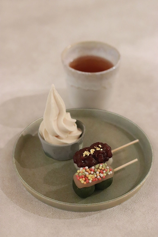もちもち食感の団子と「あん」の味わいにさらなるおいしさを添えるのは、有機豆乳と甘酒で作る自家製ヴィーガンソフトクリーム。