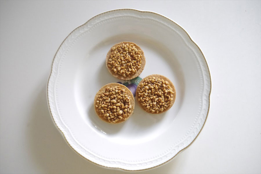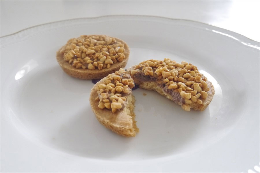 バターがしっかり感じられ、フォークで切れるほどサクサク軽い食感のタルトにヘーゼルナッツなどを使ったチョコレート・ジャンドゥーヤがオン!その上にクラッシュしたマルコナアーモンドがたっぷりまぶされています。どこを食べてもナッツ感を感じられる、濃厚でおいしいクッキー。ナッツ好きな人にとにかく試して欲しいクッキーです。