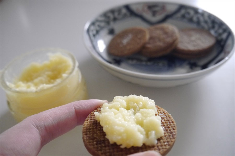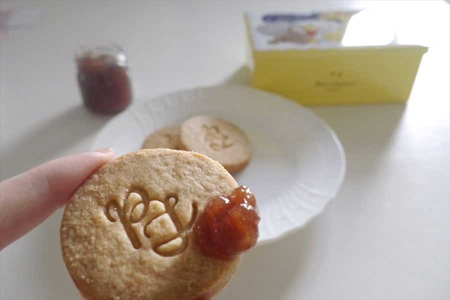なかでも注目は、イエロー缶。こちら「ファースト スウィーツ」と銘打たれていて、子どもが初めて食べるお菓子をイメージして作られたものなんです。米粉で作られたサクサクの口溶けが良いクッキーに、淡路島産のイチジクとレモンを使用したやさしい甘さのイチジクジャムをつけていただきます。たっぷりジャムをつけて食べるとよりおいしい!
