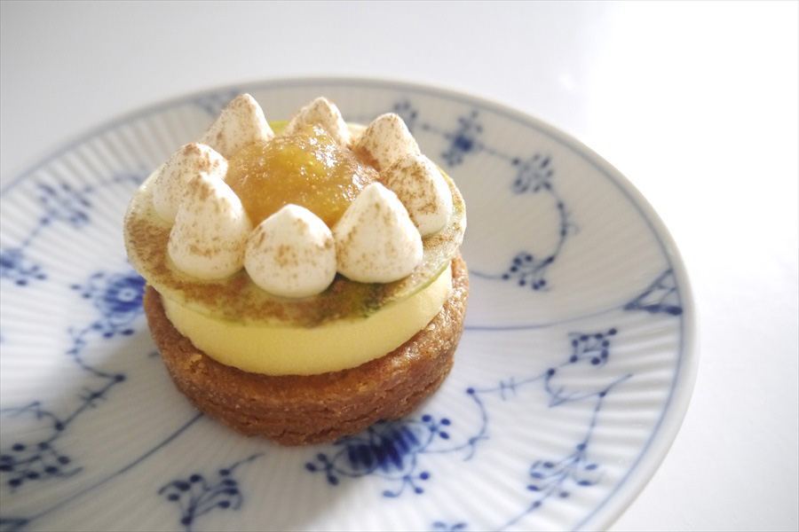 「2種のチーズと高知県産ゆずピュレを使用した AOPバターのガレッタルト」651円(1日100個限定)。爽やかなレアチーズと、濃厚なベイクドチーズの2種類のチーズを楽しむことができます。またセンターのゆずピュレは、高知県産ゆずの果肉感や皮の苦みすら感じるかなり酸っぱめのピュレ。個性的なこの3つにガレッタルトが組み合わさると、濃厚なのに爽やかで唯一無二なチーズケーキに!シナモンの甘い香りがさらに食欲をそそります。