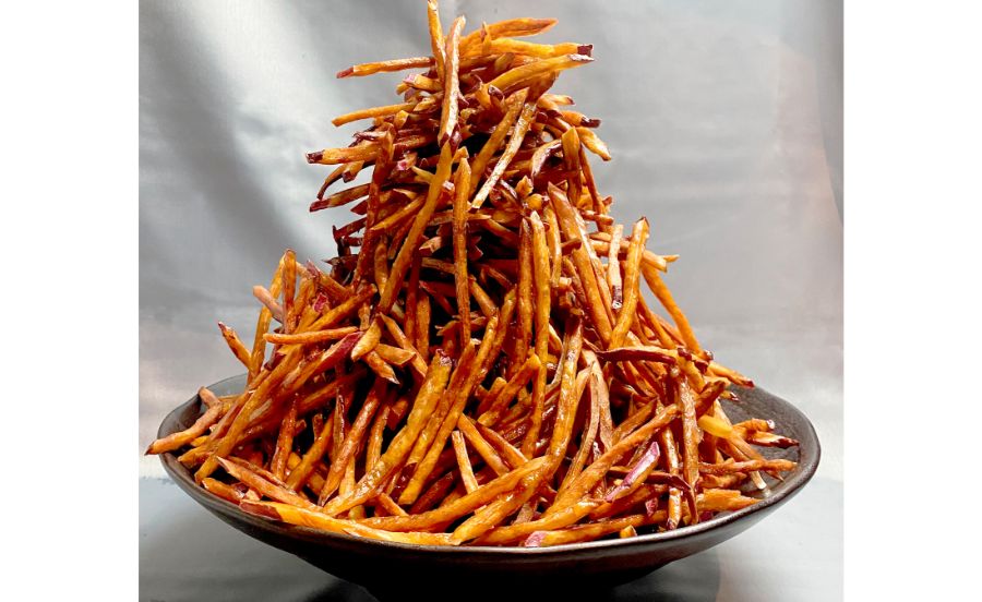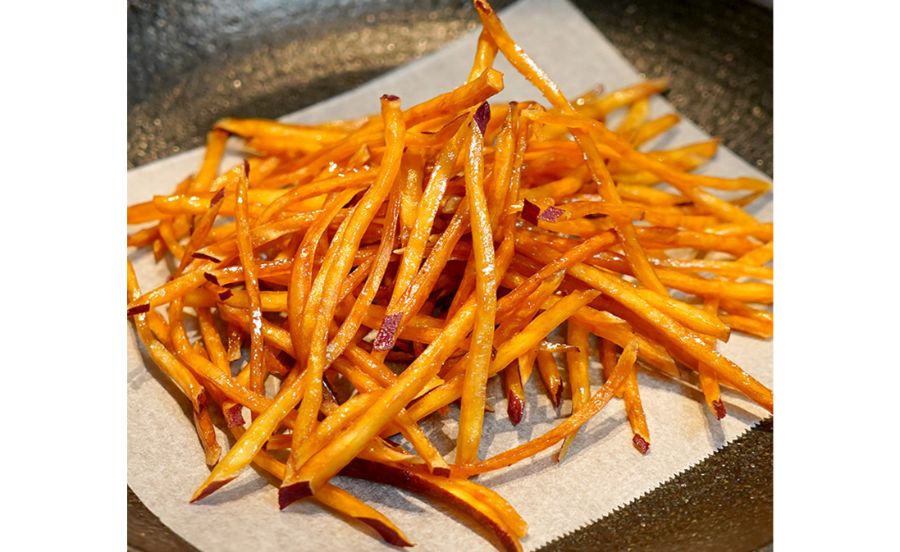 「半生芋けんぴ」は、極細にカットした旬の芋を二度揚げし、きび糖の蜜に潜らせ、カリカリの食感と蜜のしっとり感が楽しめる。大学芋と芋けんぴが融合したかのような味わいが魅力。