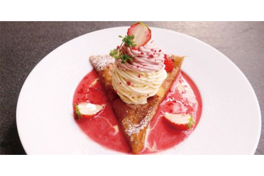 また季節ごとのスペシャルなクレープも人気です。苺とホワイトチョコ2種類のムースをモンブランのように盛り付け、ジューシーな苺のスープと一緒にいただく「苺とホワイトチョコのモンブランクレープ ~苺のスープ仕立て~」プレミアムクレープセット1,320円のみのメニューなども。