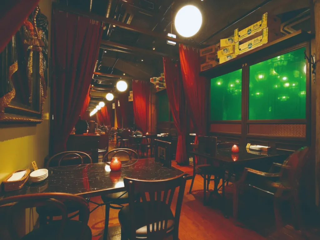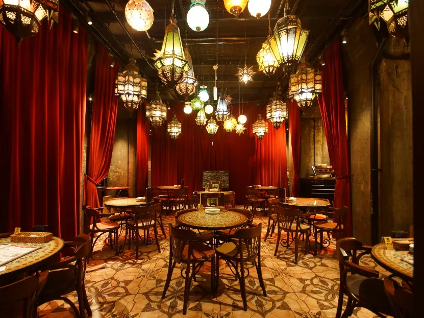 阪急大阪梅田駅から少し歩いたところにある、JR高架下の140席を越える梅田最大級のヨーロピアンバール。赤のベロアカーテン、モロッコランプが吊り下げられた大広間など、ヨーロッパの街角のような異国情緒溢れるお店が「BARBARA market place GRAND ROYAL 2429 中崎本店(バルバラマーケットプレイスグランドロイヤル)」です。