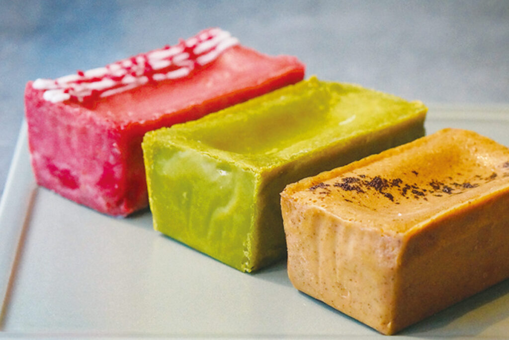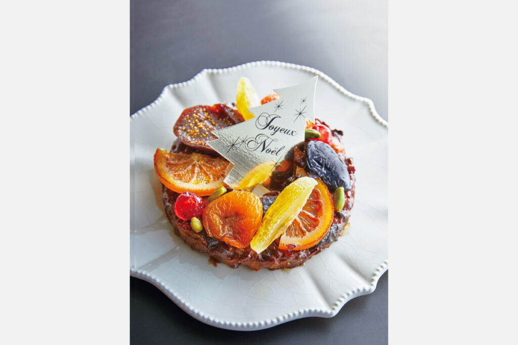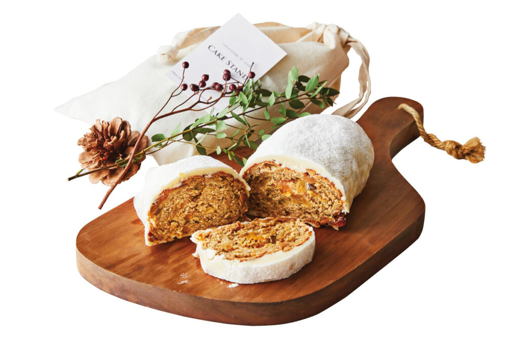 セミドライの洋梨やイチジクなどをキル酒とスパイスに漬け、アーモンドやクルミなどと混ぜ、生地でまとめて焼くお菓子は、ほぼ果物というリッチさ。果実の持つ水分が感じられるセミドライならではのしっとり食感が味わい深く、クローブや黒胡椒などがアクセントに。クリスマスまで味の変化を楽しむ大人の贅沢を満喫しよう。