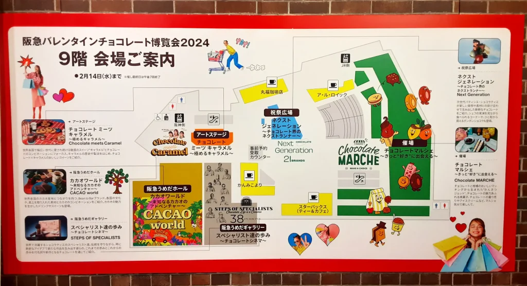 阪急うめだ本店全館で開催中の「バレンタインチョコレート博覧会2024」ですが、やっぱり一番の注目フロアは9階の祝祭広場・催場。今年はフロアを5つのエリアにわけて展開されています。