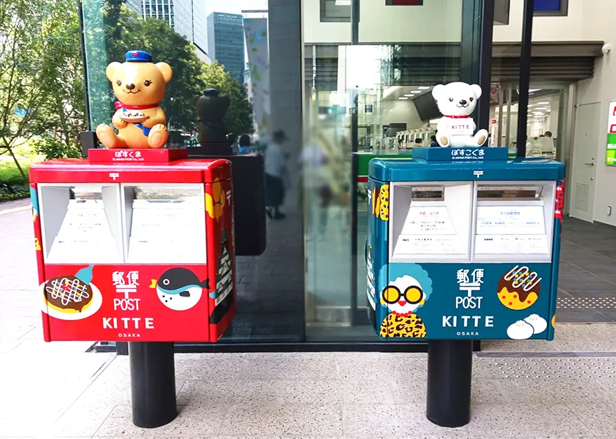 また、KITTE大阪1階には大阪中央郵便局も健在!なかでも注目は、大阪中央郵便局入口にある、ぽすくまがたこ焼きを持ったモニュメントのあるポストです。訪れたならぜひ写真を撮っておいて!