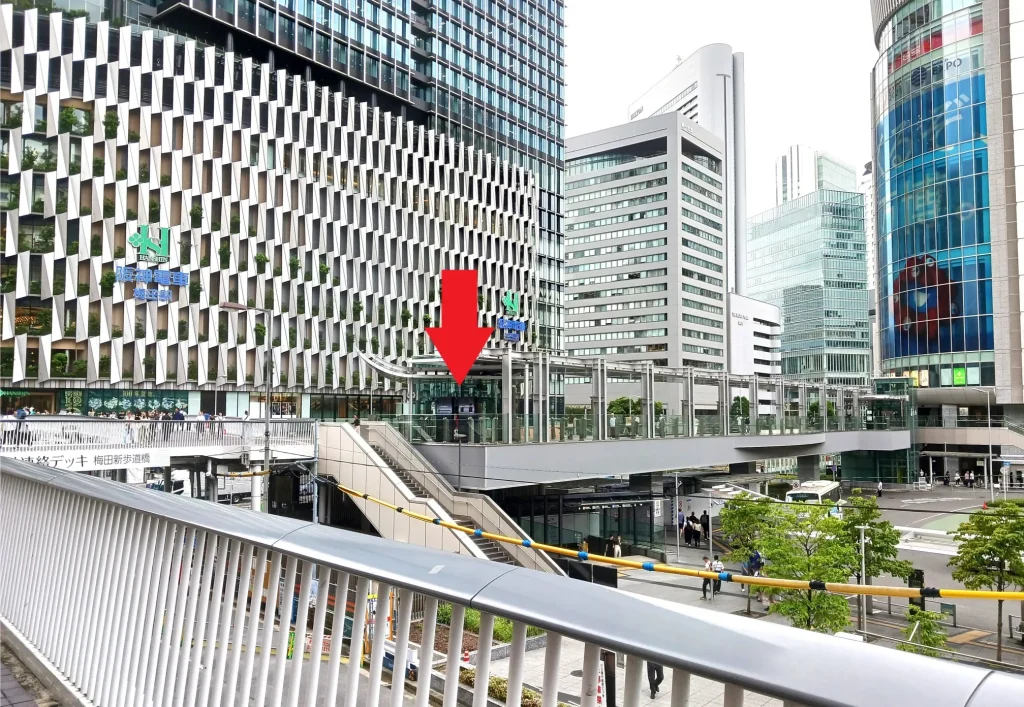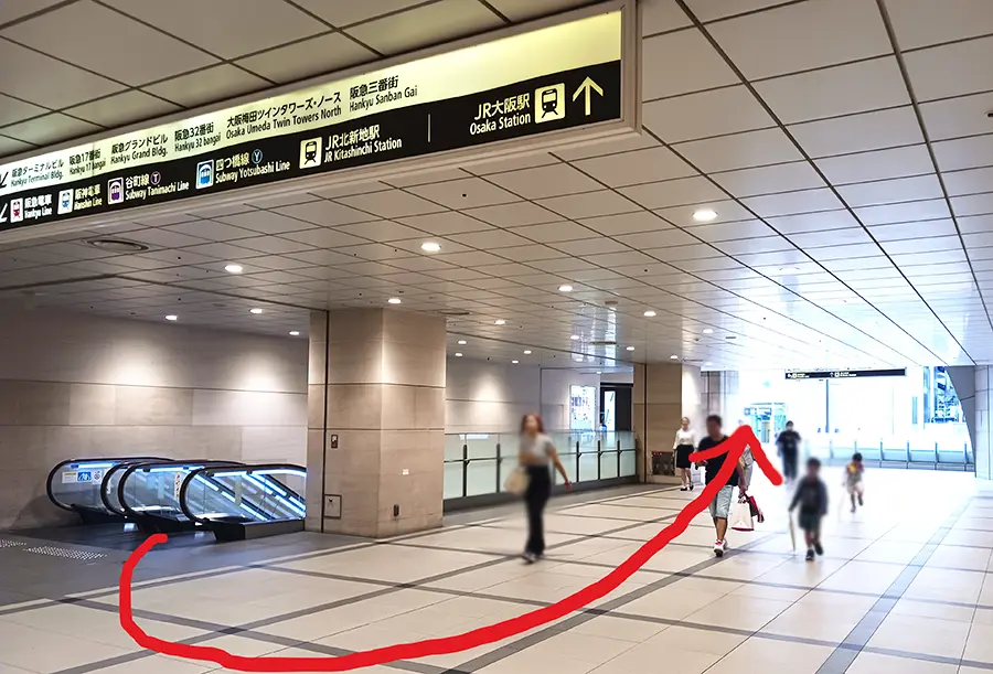 2 8番出口を出たら左折です。赤い矢印のエスカレーターを目指し、連絡橋にあがりましょう! あとは、阪急大阪梅田駅からの7番以降のアクセスと同じです。