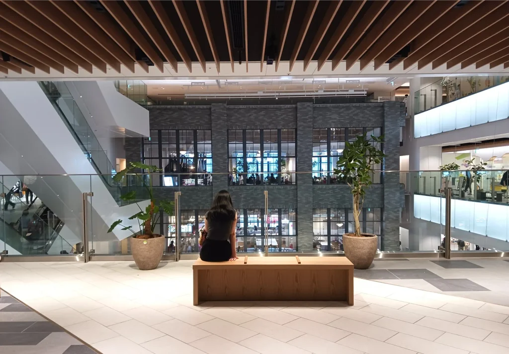 また、「KITTE(キッテ)大阪」では、館内の至る所でベンチなどが大変多く設置されているということ。お買い物に疲れた時、お買い物後の荷物を整理したい時、誰かとの待ち合わせになど、このようなベンチがたくさん設置されているのは、本当にうれしいですよね。