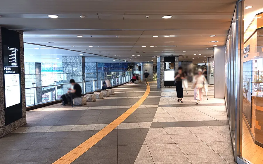 7 屋根があるところを奥に進みます。右にはJR大阪駅、左に阪神百貨店を見ながら進みます。OsakaMetro梅田駅の方もここからは同じアクセスです。