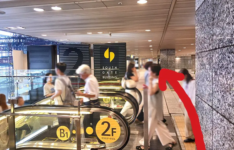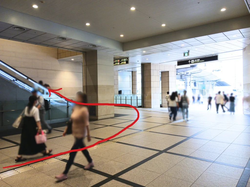 3 JR大阪駅の横断歩道手前の左に見えるエスカレーターで2階へ上がります。