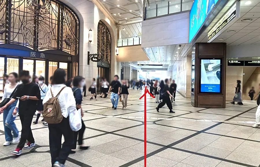 2 阪急うめだ本店の前を右へ。JR大阪駅方面に向かう途中、左部分に上のフロアにあがるエスカレーターを目指します。