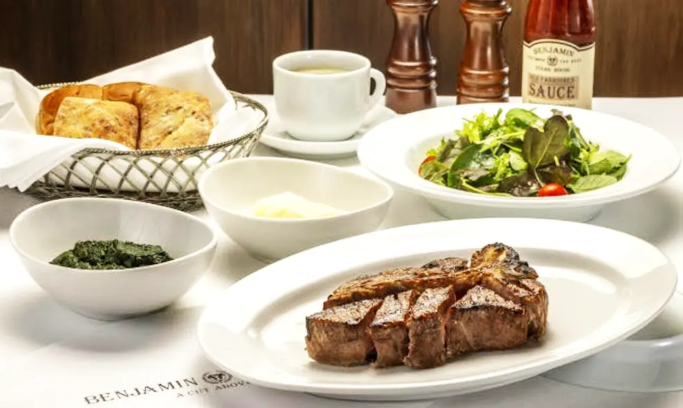 「ベンジャミン ステーキハウスKITTE大阪店」では和牛の霜降りとはまた違う、長期熟成したやわらかくも弾力のある肉本来の美味しさが堪能できるUSDAプライム フィレミニョンがおすすめ! 付け合わせで提供される、クリームを一切使わずにほうれん草を煮込むクリームレスクリームスピナッチもあわせて楽しんでみて!