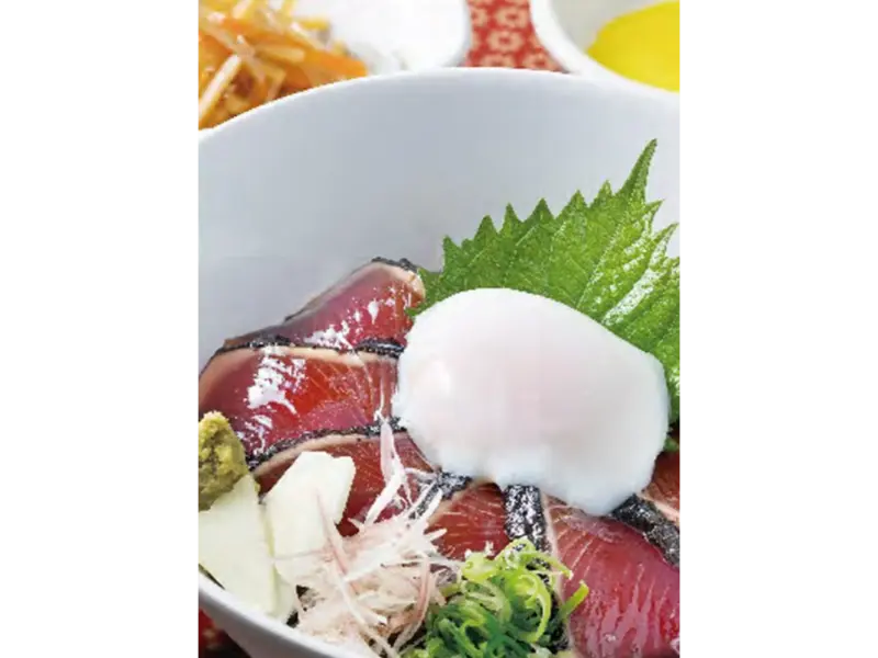 「明神丸KITTE大阪店」には、丼もありますよ!「特製鰹漁師の漬け丼」は、特製のタレに漬け込んだカツオをご飯に乗せ、ミョウガ、シソ、ネギ、温玉を合わせた丼です。ごはんをかきこみたい!という人にもぴったりのメニューです。