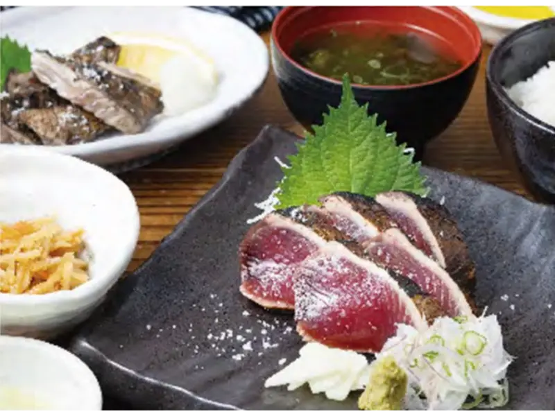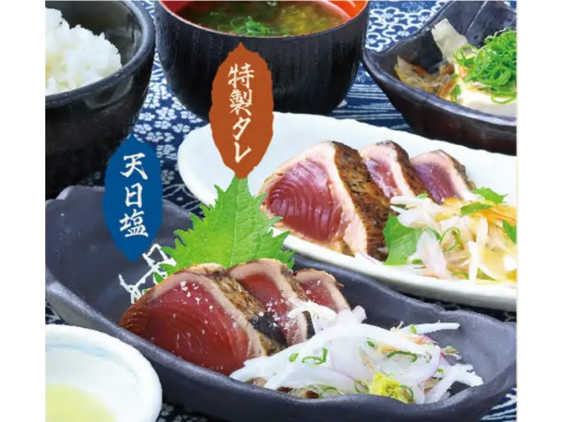 まずはこれ!の「明神丸KITTE大阪店」名刺代わりの一品が「焼き切りこれやき定食」。高知県産の天日塩で食べる塩たたきと特製ポン酢のタレたたきの両方が一緒に楽しめるセットです。定食なので、どんなのかわからない人でも安心して注文できますね。ランチで高知の人気の味が大阪でも楽しめるなんて!「明神丸KITTE大阪店」の定食は、ご飯1杯までおかわり無料ってのもうれしいですね。
