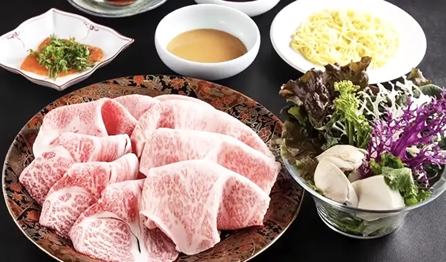 こちらのランチは、すき焼き・しゃぶしゃぶのいずれかから選ぶセット。こだわり野菜の盛り合わせに、鹿児島黒毛和牛肩ロース20g・ブリスケ30g、鹿児島黒豚肩ロース60gがついた牛も豚も楽しめるお得なセットです。シメには、白米かラーメン、うどんのいずれかをつけることができます。
