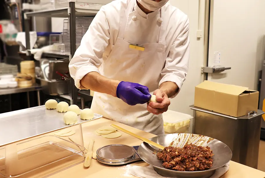 東京の店舗では1日2,000個も注文が入る「ベイクド チャーシューバオ」は、甘辛いチャーシュー餡を生地で包みその上にクッキー生地をのせオープンで焼き上げる一品。クッキー生地はサクサク、中から角切りの甘辛いチャーシューがとろり出てくる逸品です。サイズも小ぶりで食べやすく、おやつにもごはんにもなるおいしい一品。