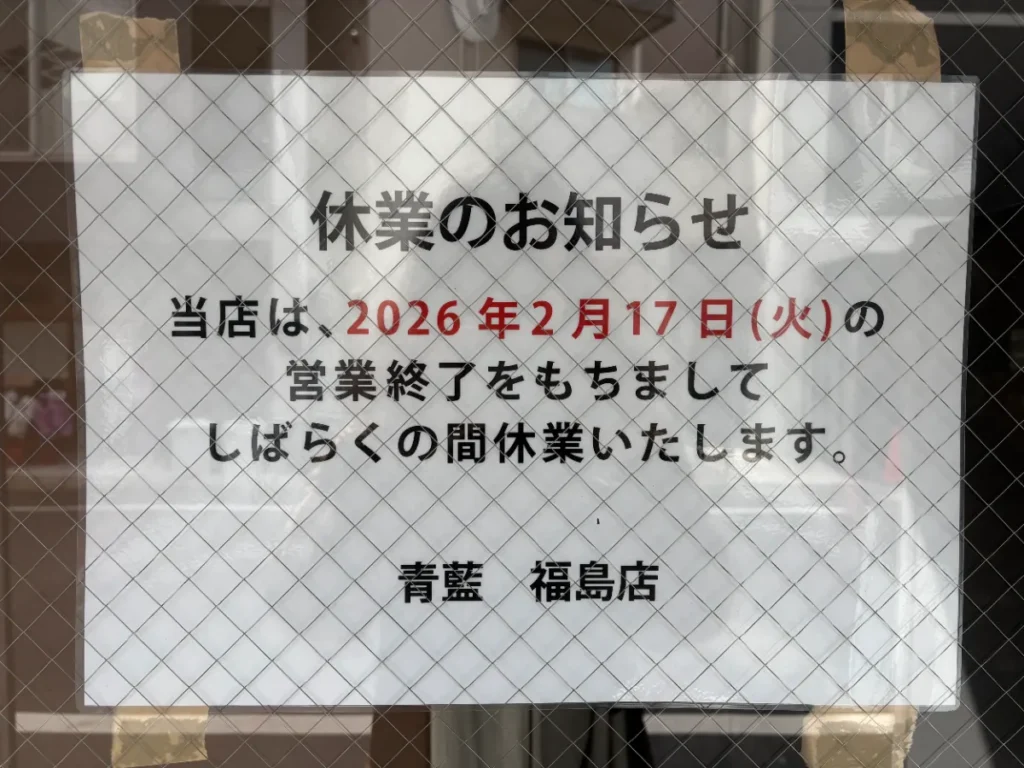 JR福島駅、新福島駅のちょうど中間あたりに位置する「担々麺 青藍 福島店」が2月17日(火)の営業をもって臨時休業に入っています。オープンは2025年2月と1年ほどでの休業だけとあって、少々心配です。