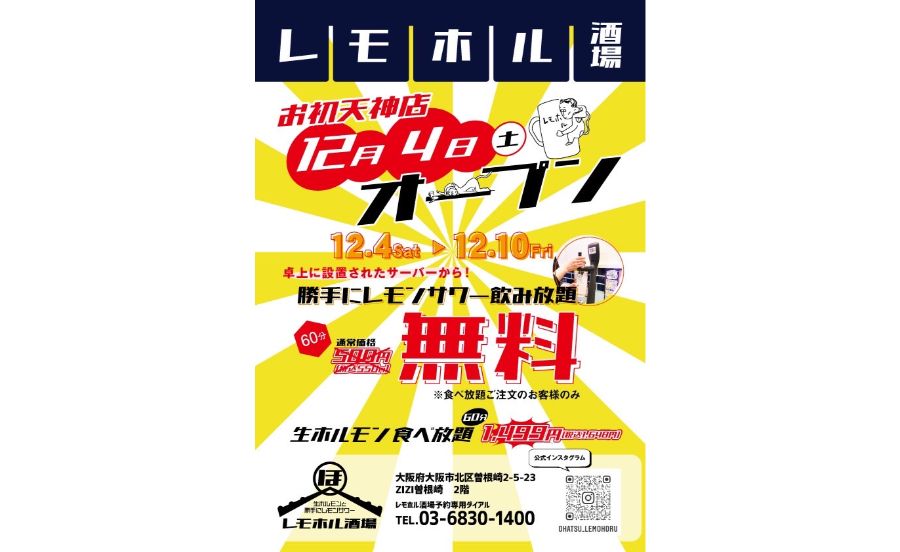 卓上レモンサワーが話題の『レモホル酒場』が、大阪・梅田のお初天神に2021年12月4日(土)オープンする。