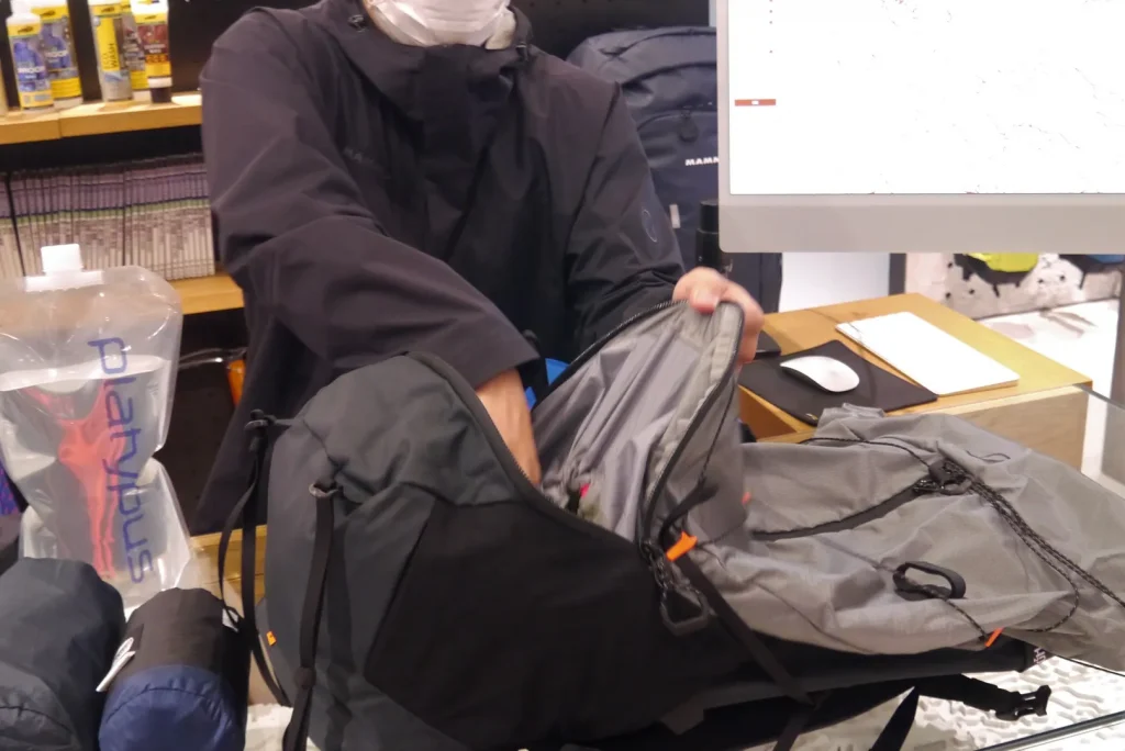 今回のボリュームだと重さは大体12~13kgとのこと(川村さん は、普段登山時にカメラなどを持参することが多いので、総重量は20~30kgにもなるとのこと。お…重そう)。背負い方やどのようにすれば重さを軽減できるのかなども教えてもらえるので、ぜひ相談してみて。