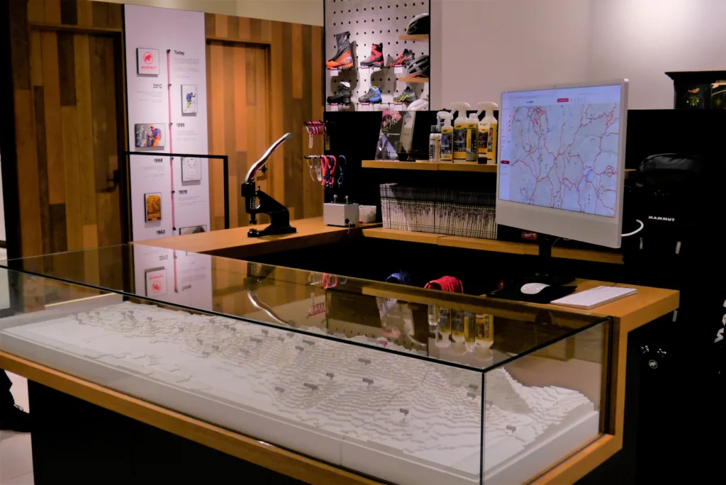 この「ヒュッテ1862」には、4つの特徴があり登山の相談(登山地図を使用しての行程確認や天気に合わせた装備の相談など)ができること、 「マムート」製品などを使ったパッキング方法やパッキングをもとに最適なサイズのバックパックのご案内、物を長く愛用して欲しいというブランドコンセプトに基づいたプロダクトケアの方法、最後はブランドの根幹であるロープを使ったアクセサリー作りなどワークショップの体験スペースとして設けられています。