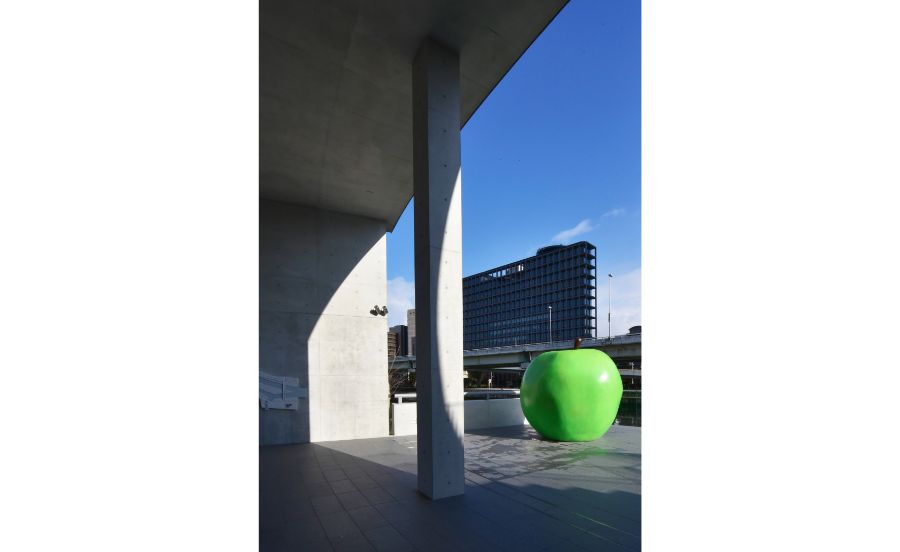 「こども本の森 中之島」の外観は、安藤さんの代名詞ともいえるコンクリート打ちっぱなしの建物が特徴です。そんな都会的な外観に、ひと際目立つオブジェが「青いリンゴ」。これは米国の詩人でサムエル・ウルマン「青春」の一文「若さとは、年齢でなく心の持ちようだ」というメッセージに安藤さんが共感し、自身でデザインしたもの。丸くて大きくて青々しい青春が詰まったオブジェに、安藤さんの思いを感じてみて。