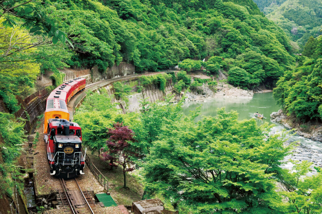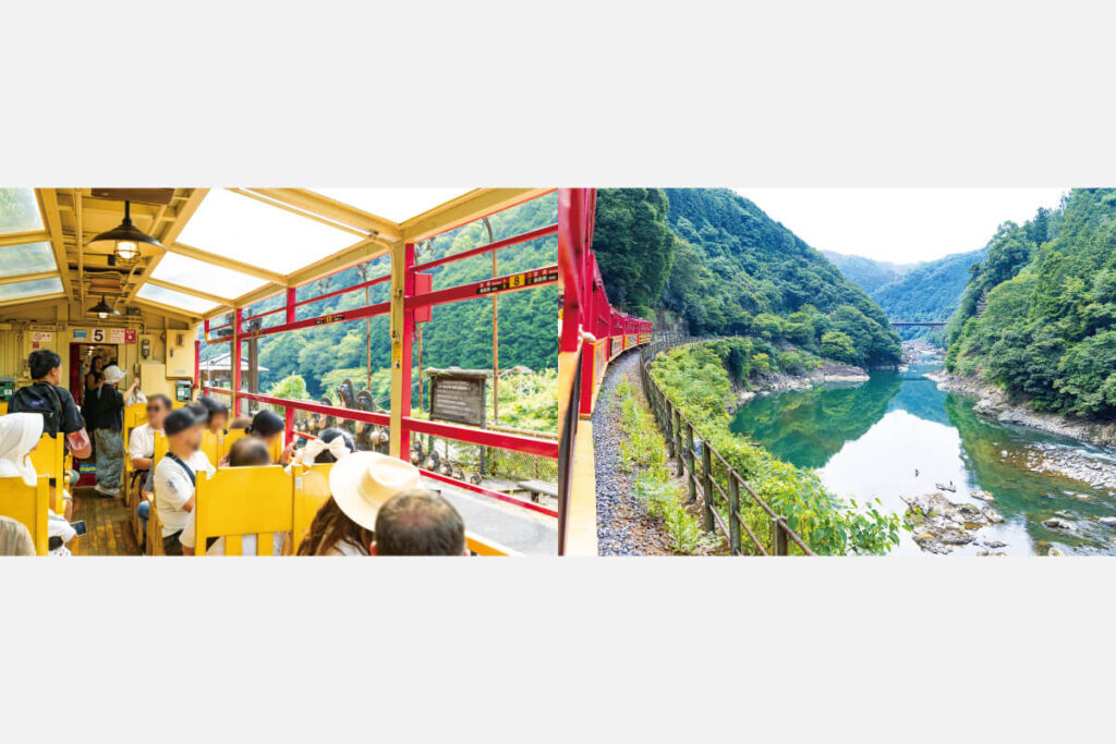 一番の見どころは、保津峡の雄大な渓谷美。列車の走行エリアは、桜や紅葉の名所としても有名だが、木々の生命力を感じる緑の時期も絶景。時に穏やか、時に荒々しい保津川の水面を眺めるのもおもしろい。