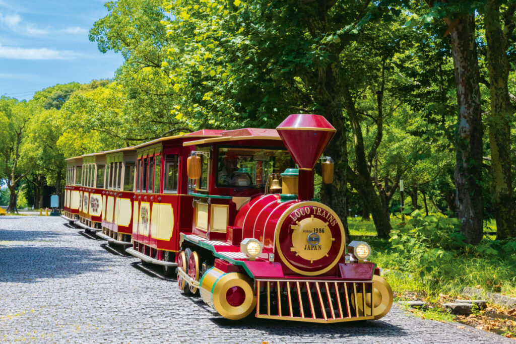 万博記念公園の自然文化園エリアを走る「森のトレイン」。洋風でレトロな車両デザインは、1880年にアメリカから日本に輸入された蒸気機関車「弁慶号」がモチーフ。園内の移動手段として利用されているほか、徒歩で巡るよりも広いエリアを短時間で周遊できると人気。
