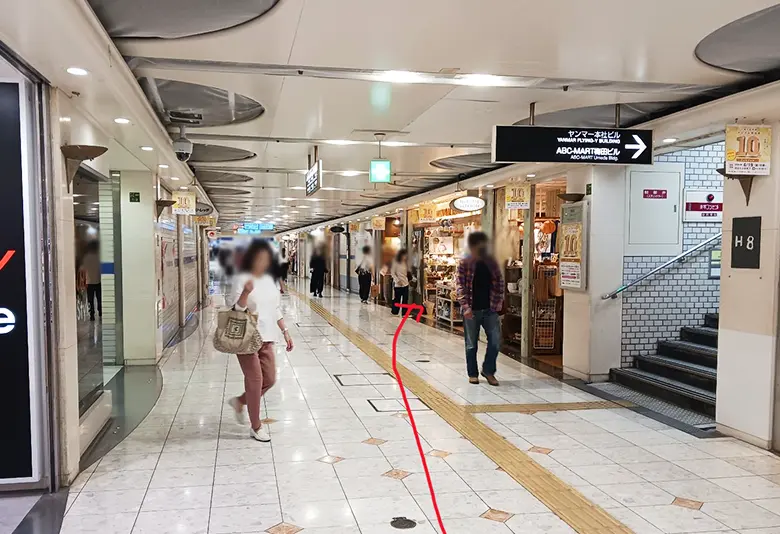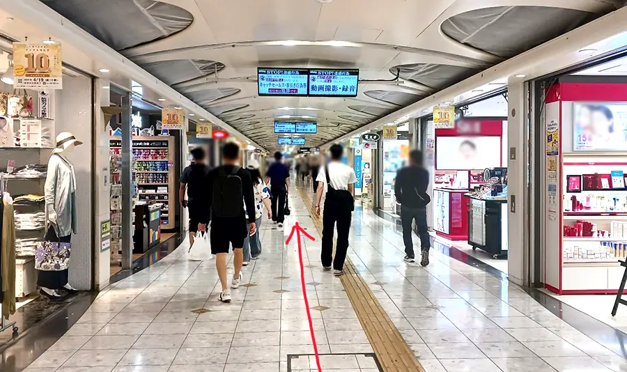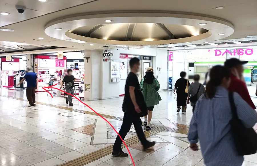 1 阪急大阪梅田駅2階改札を出て階段・エスカレーターを降りたら左折。ホワイティうめだへ向かいます。DAISOが見えたら、その手前の道を左へ。